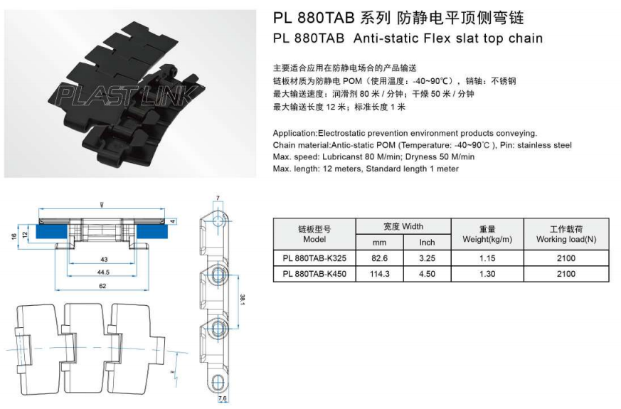 PL880Tab - RT Small Radius Flex Slat Top Chain
