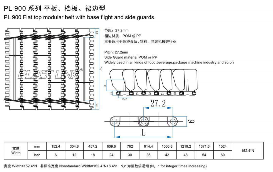 ベースフライトとサイドガードを備えたPL 900フラットトップモジュラーベルト。