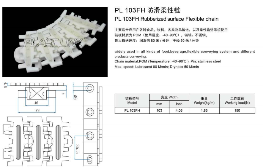 PL 812FH 스테인리스 스틸 고무 표면 직선 상단 체인