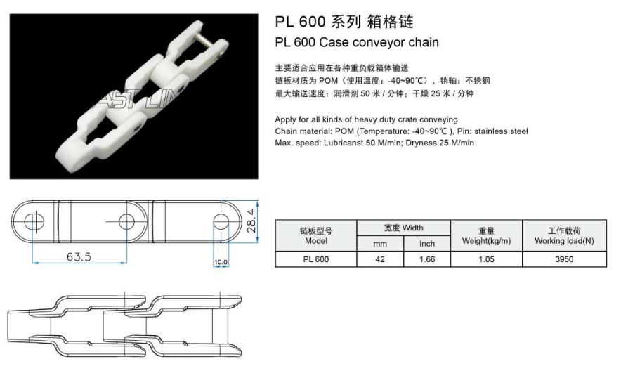 PL600S 슬랫 탑 케이스 컨베이어 체인