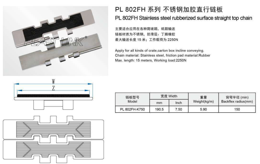 PL802FH 스테인리스 스틸 고무 표면 직선 상단 체인