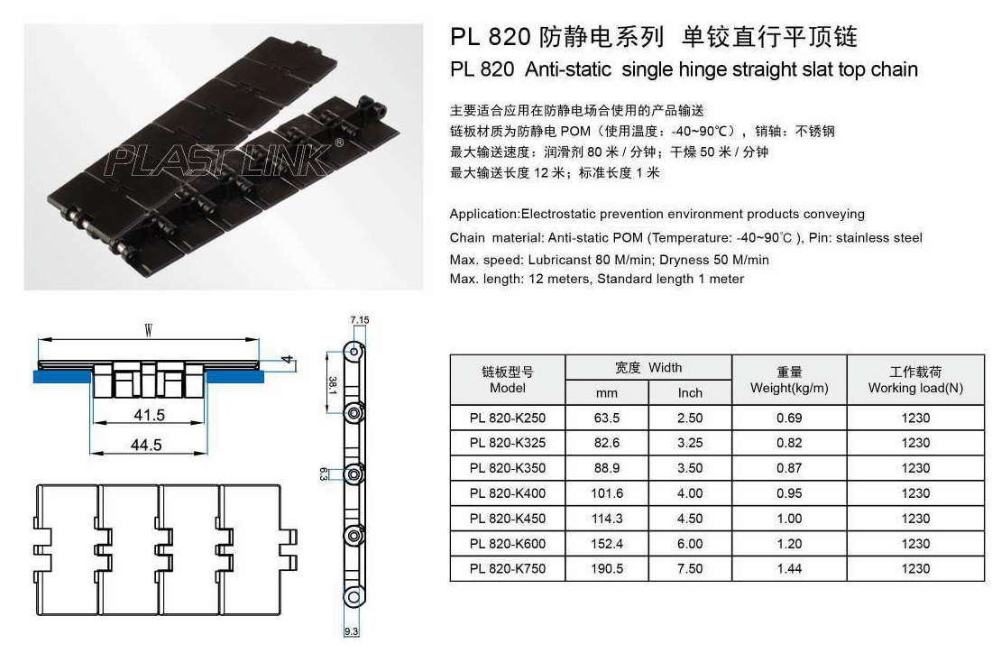 PL820 Anti-static single hinge straight slat top chain