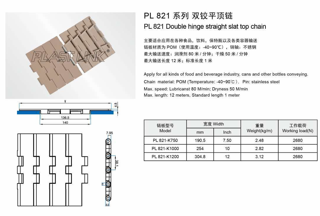 PL821 Double hinge straight slat top chain