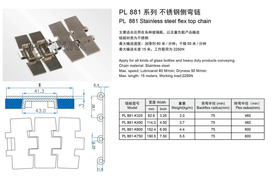 PL881 Stainless steel flex top chain