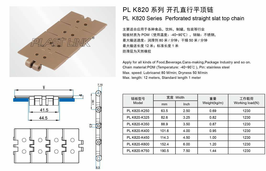 PlK820 Series Perforated straight slat top chain