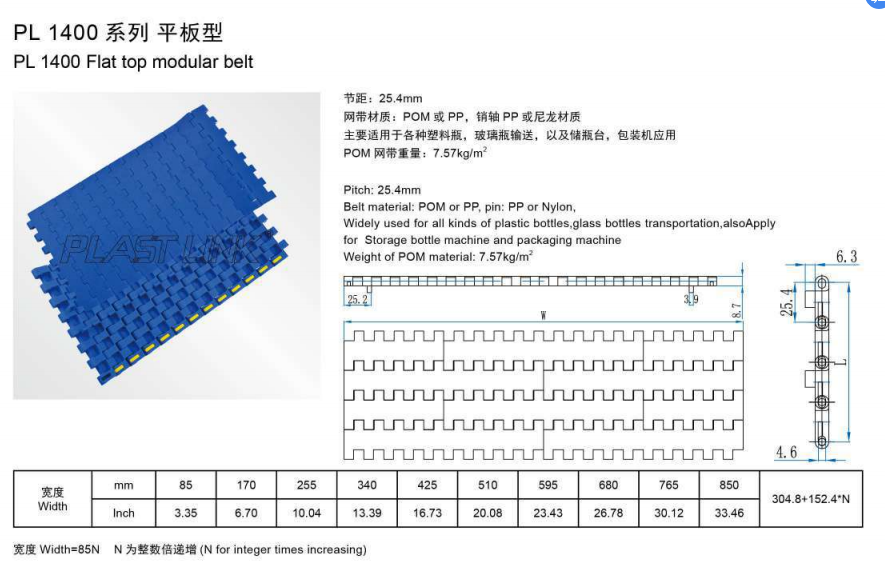 PL 1400 модульный ремень с плоским верхним верхним краем